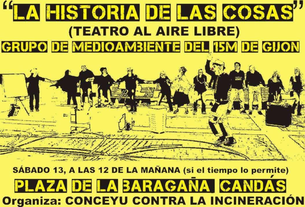 El próximo sábado 13 de abril se podrá ver de forma completamente libre y gratuita la “Historia de las Cosas”, un teatro al aire libre interpretado por el Grupo de Medio Ambiente del 15M de Gijón. Será en la plaza de la Baragaña de Candás a las 12 de la mañana, si el tiempo lo permite.